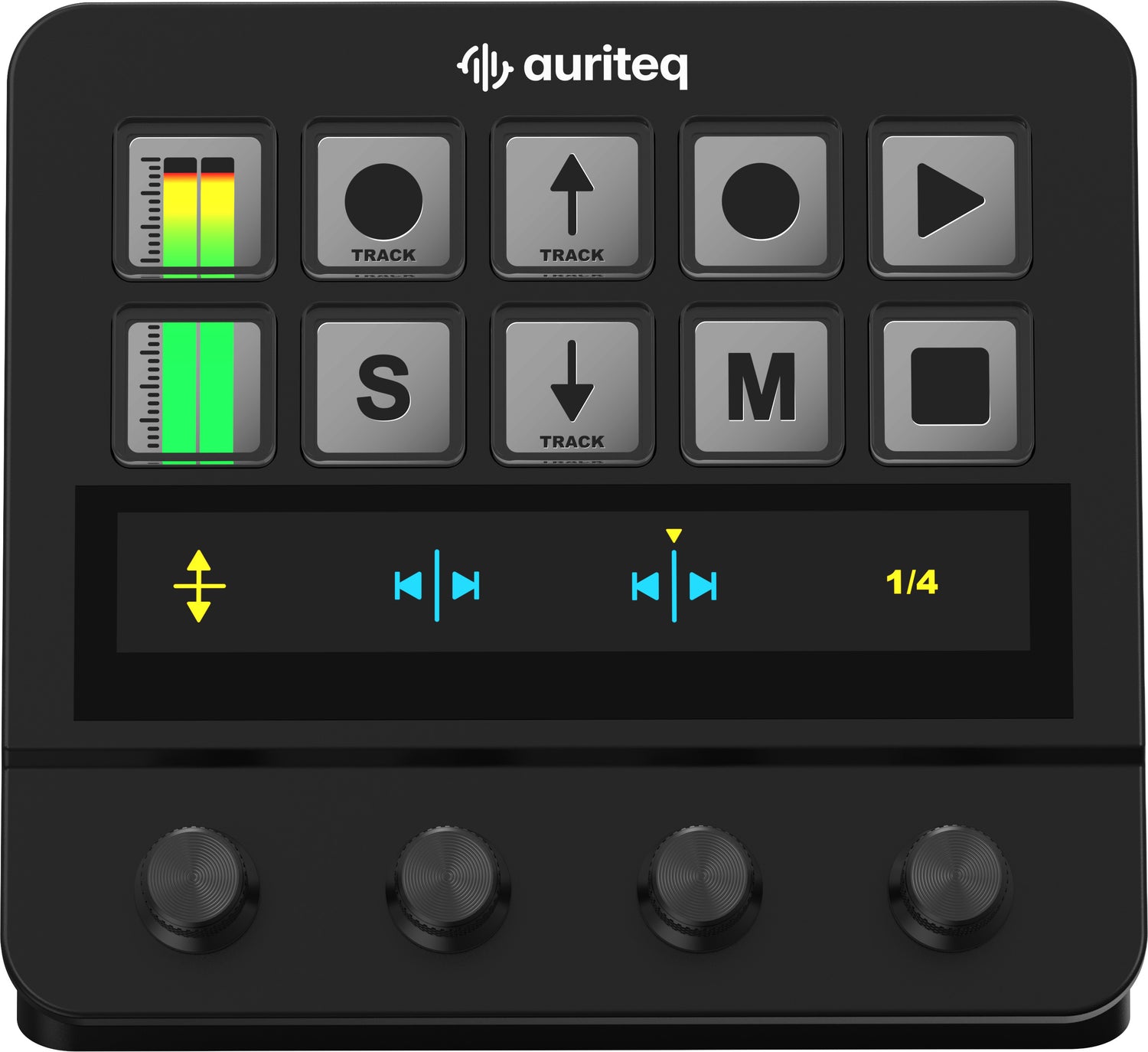 The Auriteq DAW Controller makes it simple to move through your project using the arrangement controls, allowing you to zoom horizontally and vertically, move the playhead, and set markers directly from the controller. You can also jump instantly between markers — a powerful feature that lets you move to any section of your song in seconds.