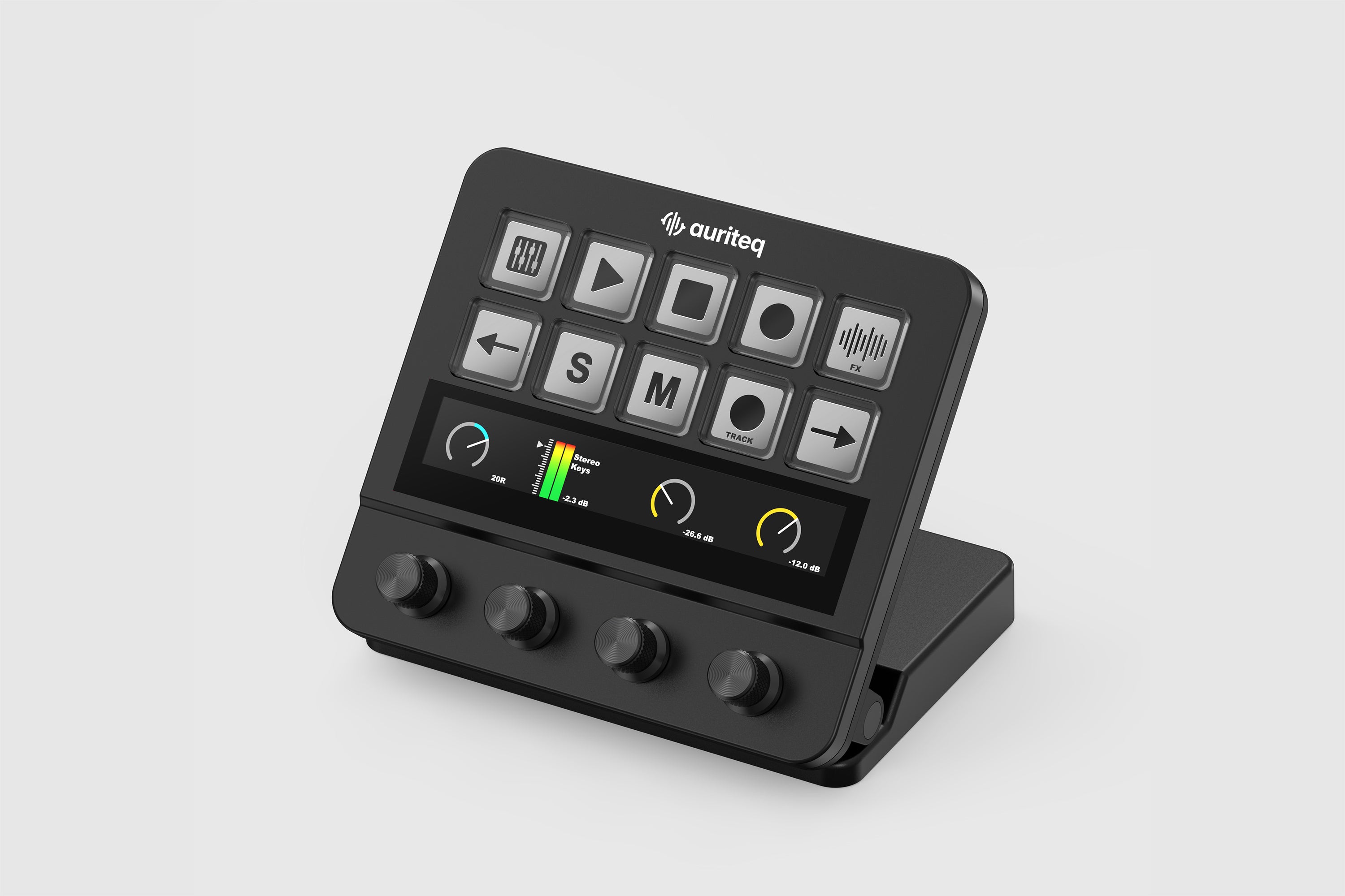 A dedicated recording mode allows users to arm tracks, monitor input levels, and start or stop recording directly from the controller. This enables recording from a distance without interacting with the computer.